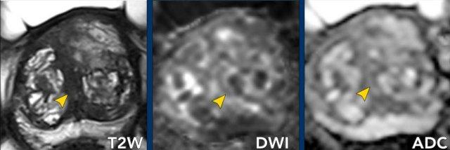 Ngoài ra, phát hiện một tổn thương nghi ngờ ở phía trước bên phải vùng chuyển tiếp với giảm tín hiệu trên T2W và ADC, tăng tín hiệu trên DWI (mũi tên đen).