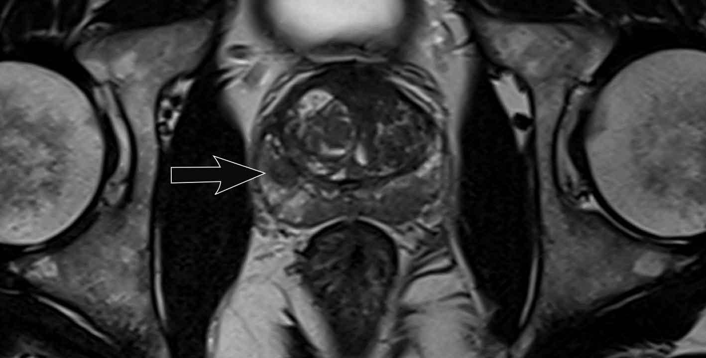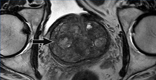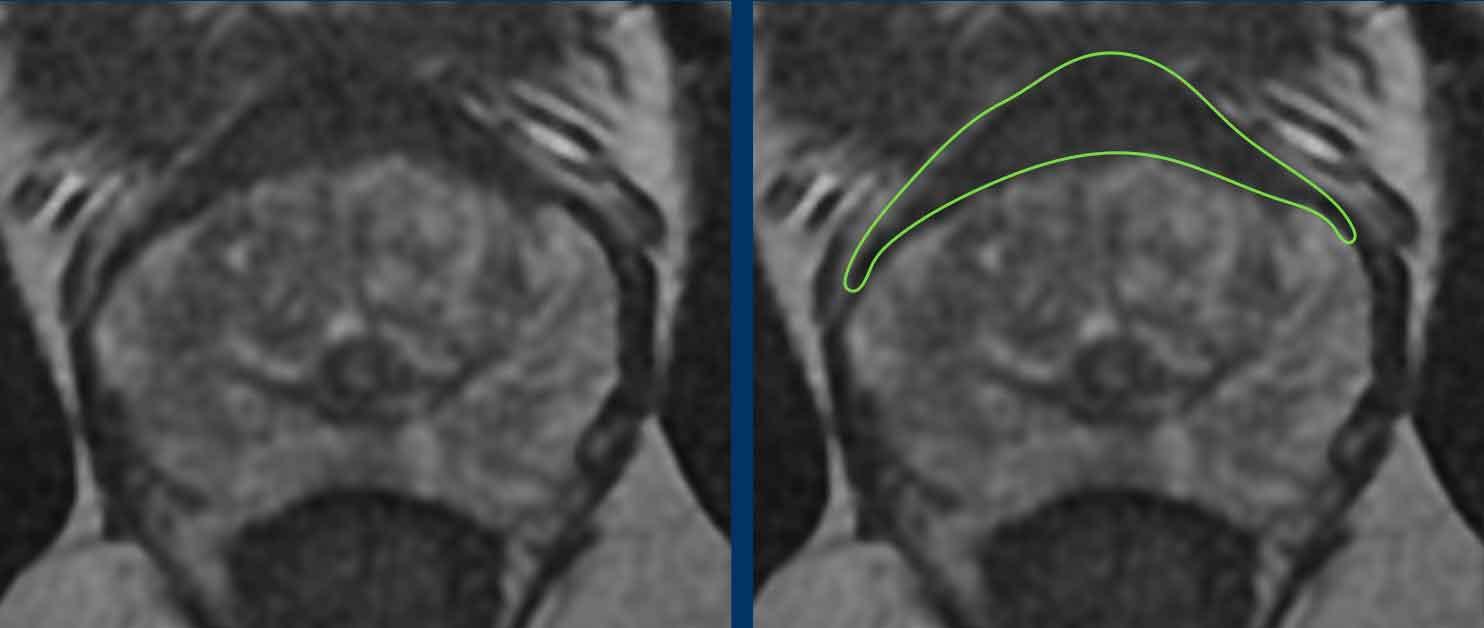 ghi nhận do vùng giảm tín hiệu ở vùng chuyển tiếp phía trước bên phải đoạn giữa tuyến tiền liệt.