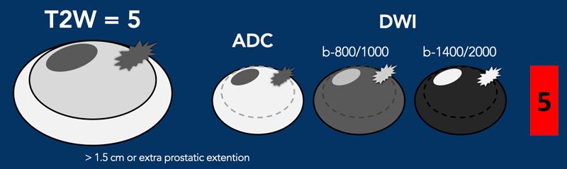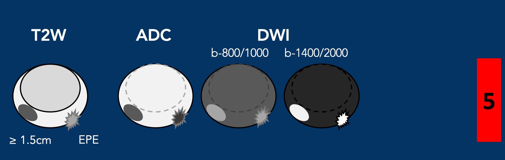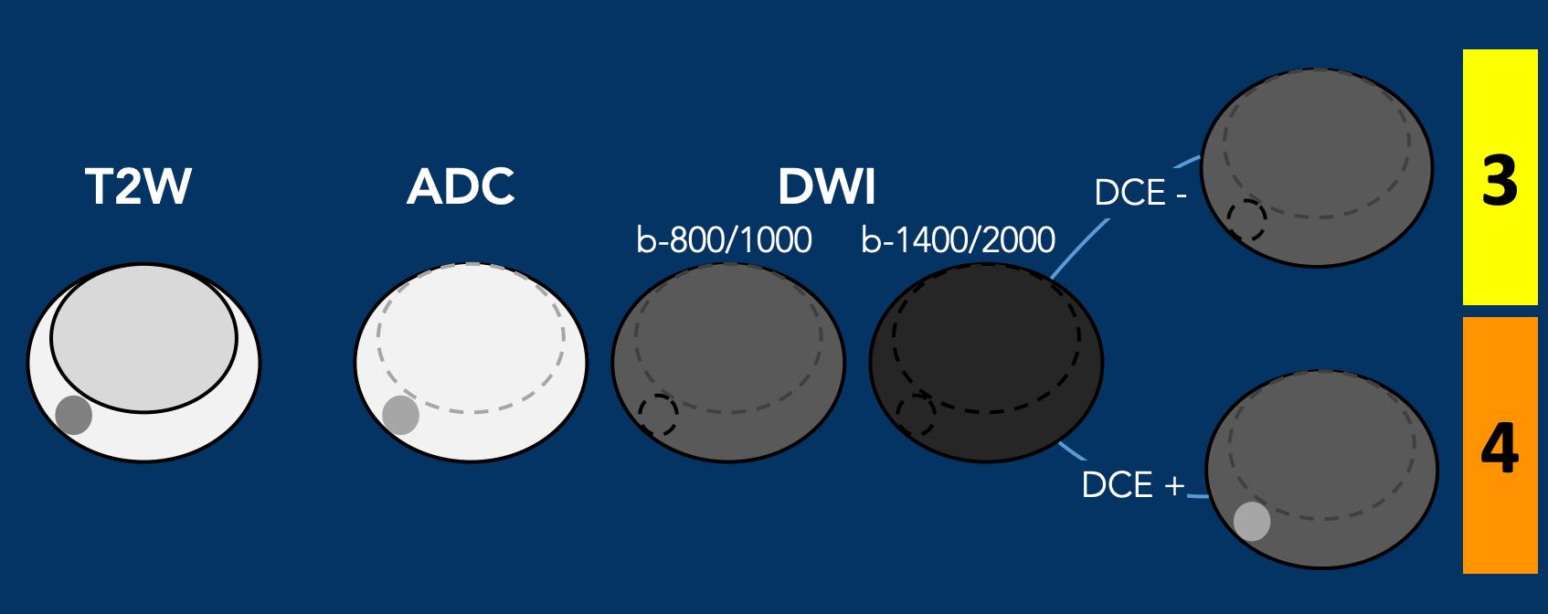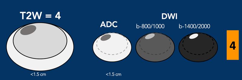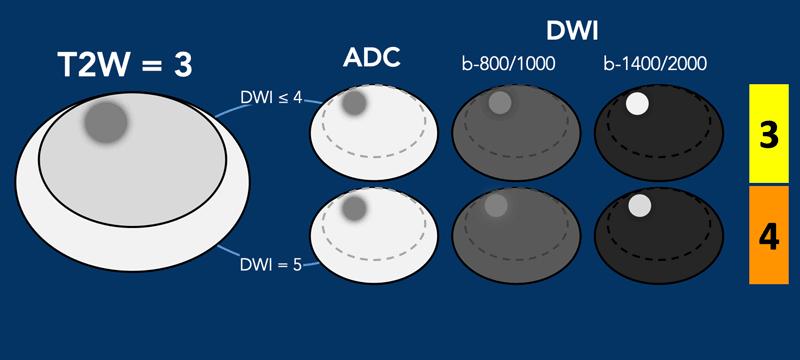 Một tổn thương được đánh giá ở phân loại 3 dựa trên chuỗi xung T2W giữ nguyên điểm PI-RADS 3 nếu DWI ≤ 4, tuy nhiên, sẽ trở thành điểm PI-RADS 4 nếu DWI/ADC đạt điểm 5.