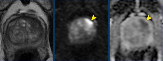 Mặt phẳng chụp là mặt phẳng ngang so với bệnh nhân hoặc mặt phẳng ngang chéo vuông góc với trục dài của tuyến tiền liệt. Cần có ít nhất một mặt phẳng bổ sung vuông góc (mặt phẳng đứng dọc và/hoặc mặt phẳng đứng ngang). - DWI
