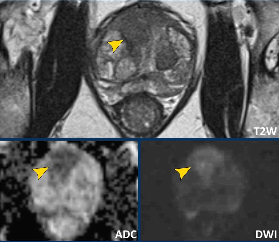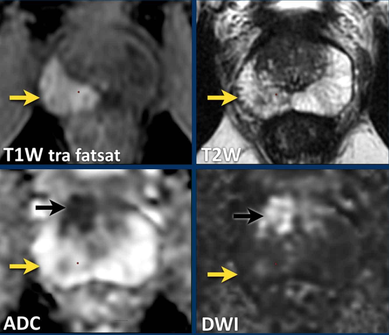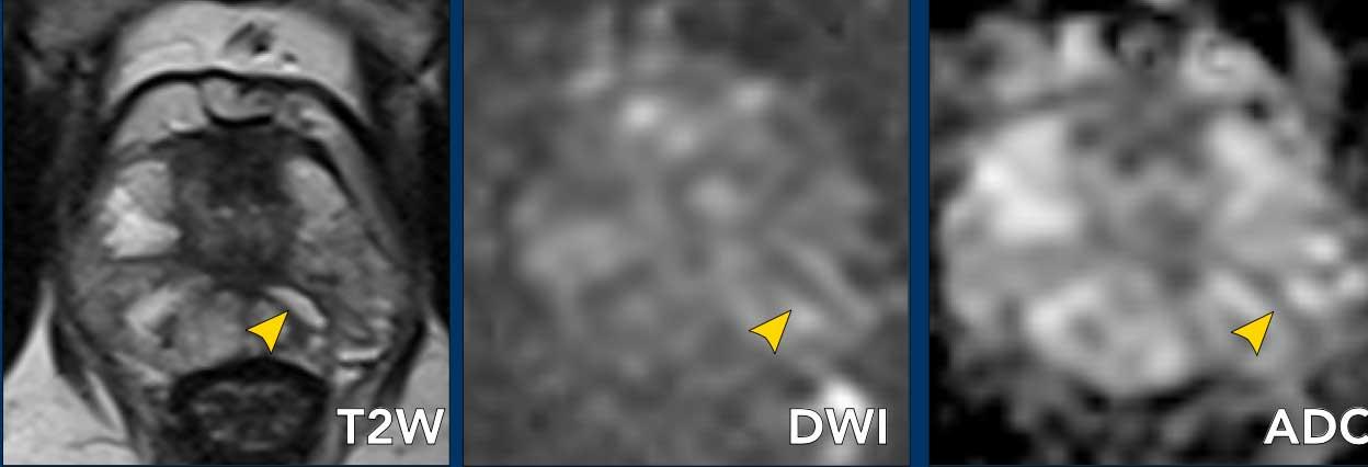 Tăng tín hiệu trên chuỗi xung T1W tại vùng ngoại vi bên phải, với giảm tín hiệu nhẹ trên chuỗi xung T2W và không có hạn chế khuếch tán trên DWI/ADC (mũi tên vàng).