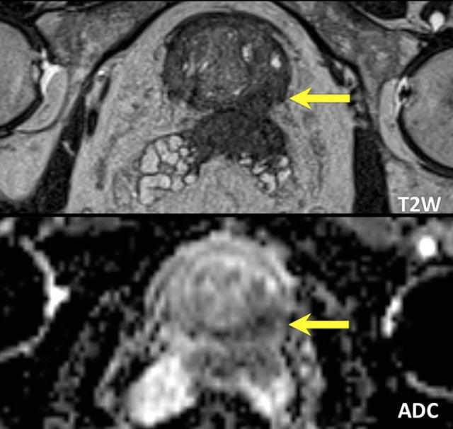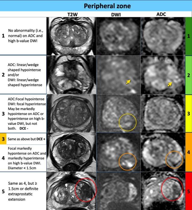 Đối với vùng ngoại vi, chuỗi xung DWI/ADC là chuỗi xung chính để xác định phân loại đánh giá PI-RADS.