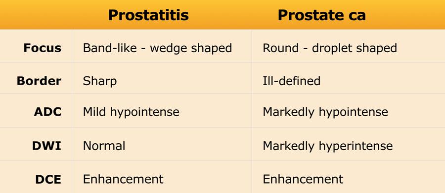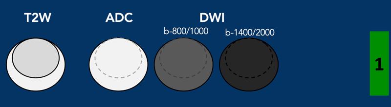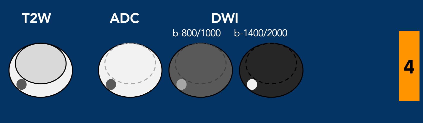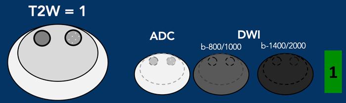 - Hình dạng tuyến tính/hình nêm với giảm tín hiệu trên ADC và/hoặc tăng tín hiệu dạng tuyến tính/hình nêm trên DWI giá trị b cao.