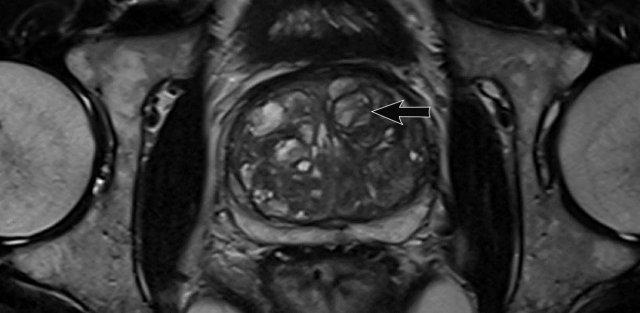 Điểm PI-RADS 5 được ghi nhận do vùng giảm tín hiệu ở vùng ngoại vi bên phải của tuyến tiền liệt đoạn giữa với