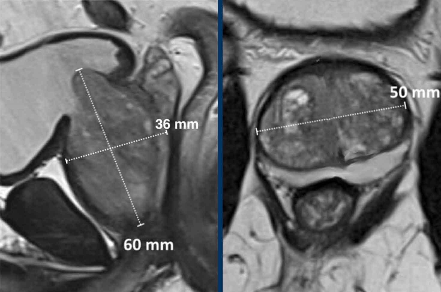 - Một tổn thương kích thước 17 mm (không hiển thị phép đo) nằm ở vùng ngoại vi, phía sau bên trái của phần giữa tuyến tiền liệt.