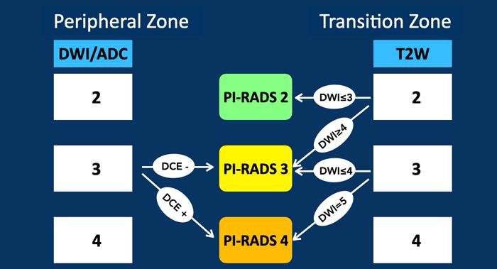 Tại vùng ngoại vi, phân loại đánh giá PI-RADS của một tổn thương được xác định chủ yếu dựa trên DWI/ADC và đối chiếu với hình ảnh chuỗi xung T2W và DCE.