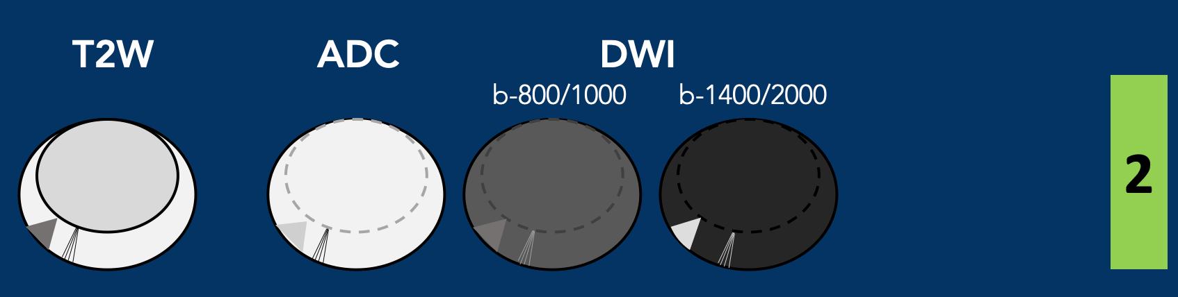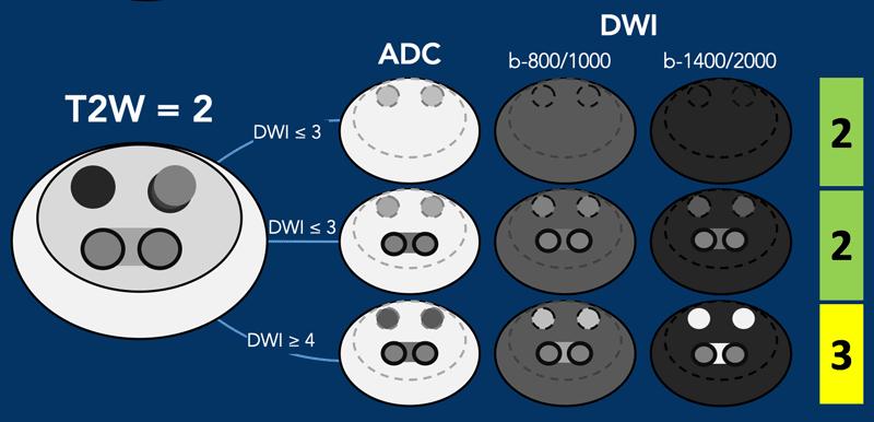 Một tổn thương được đánh giá ở phân loại 2 dựa trên chuỗi xung T2W giữ nguyên điểm PI-RADS 2 nếu DWI/ADC ≤ 3, tuy nhiên sẽ trở thành điểm PI-RADS 3 nếu DWI ≥ 4.