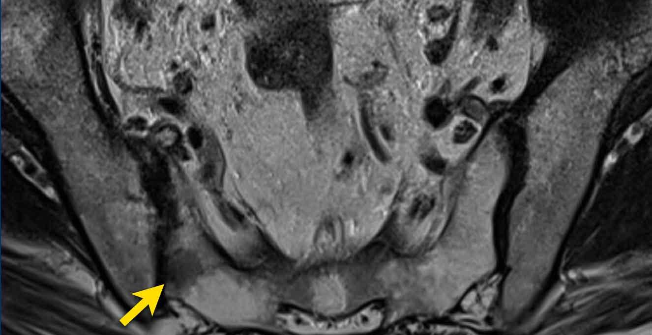 Trường nhìn (FOV) rộng đến tận chỗ phân đôi động mạch chủ giúp đánh giá tình trạng xâm lấn hạch bạch huyết ngoài phúc mạc và vùng chậu, cũng như bệnh lý di căn xương (mũi tên trong hình).