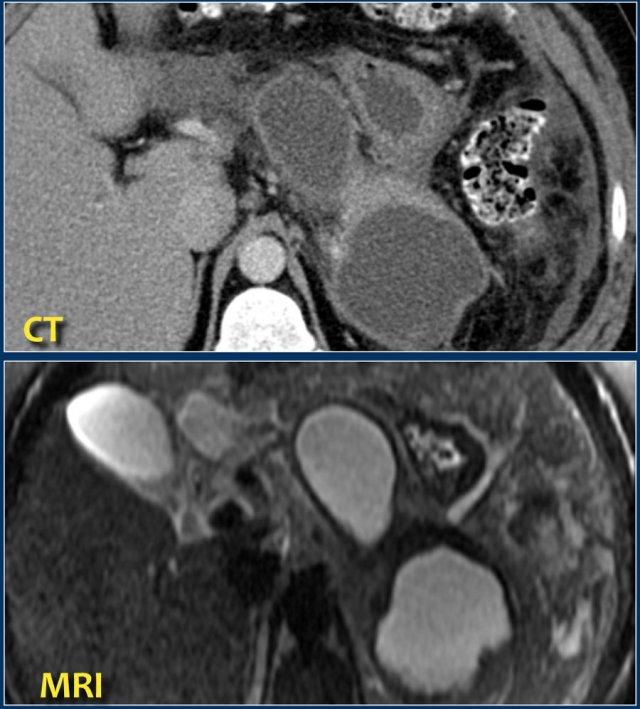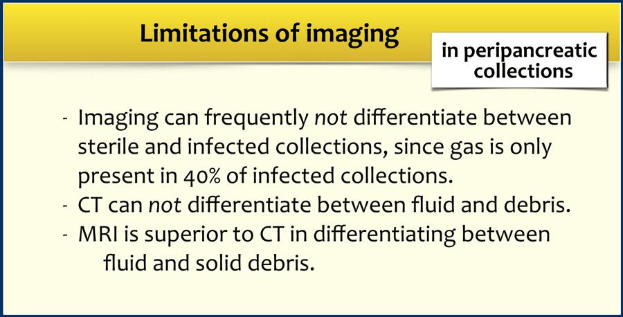 Chỉ dựa vào CT, đôi khi không thể xác định liệu một ổ dịch chỉ chứa dịch thuần túy hay hỗn hợp dịch và mô hoại tử.