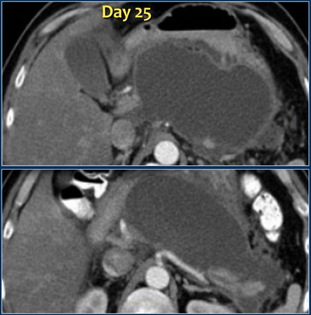 Bệnh nhân được phẫu thuật và ổ dịch được phát hiện chứa đầy mảnh vụn hoại tử, điều này không được nhận ra trên CT, do đó đây là ổ hoại tử được bao bọc chứ không phải nang giả tụy.