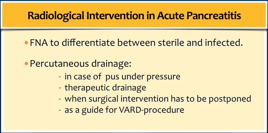 - Chiến lược can thiệp tối ưu cho bệnh nhân viêm tụy hoại tử nhiễm khuẩn nghi ngờ hoặc đã xác định là dẫn lưu qua da (sau phúc mạc) dưới hướng dẫn hình ảnh hoặc dẫn lưu qua nội soi xuyên thành, tiếp theo nếu cần thiết là cắt lọc hoại tử qua nội soi hoặc phẫu thuật.