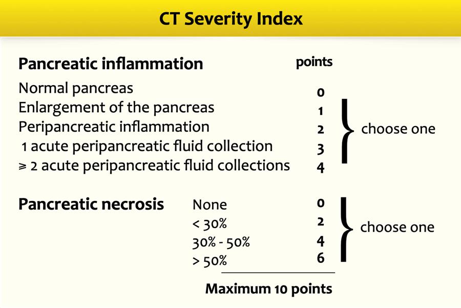 Chỉ số mức độ nặng trên CT (CTSI) kết hợp phân độ Balthazar (0-4 điểm) với mức độ hoại tử tụy (0-6 điểm) trên thang điểm mức độ nặng 10 điểm.