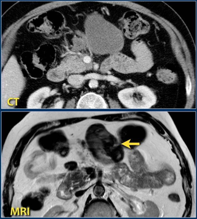 CT cho thấy ổ dịch có tỷ trọng tương tự như bệnh nhân có nang giả tụy, ngoại trừ vị trí nằm trong tụy.