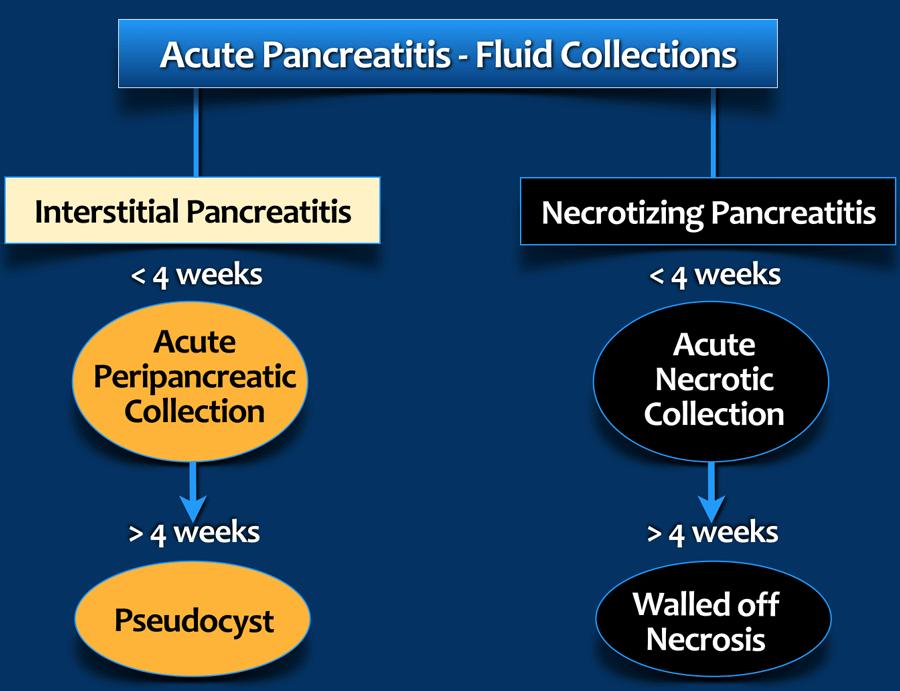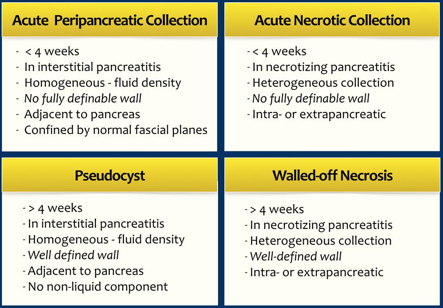 Phân loại Atlanta Sửa đổi năm 2012 phân biệt 4 loại tụ dịch quanh tụy trong viêm tụy cấp dựa trên thành phần, mức độ bao bọc và thời gian.