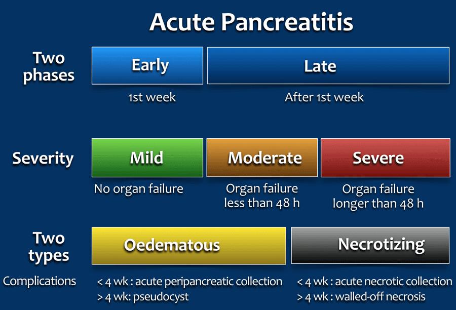 Về mặt thời gian, Phân loại Atlanta Sửa đổi xác định hai giai đoạn của viêm tụy cấp:
