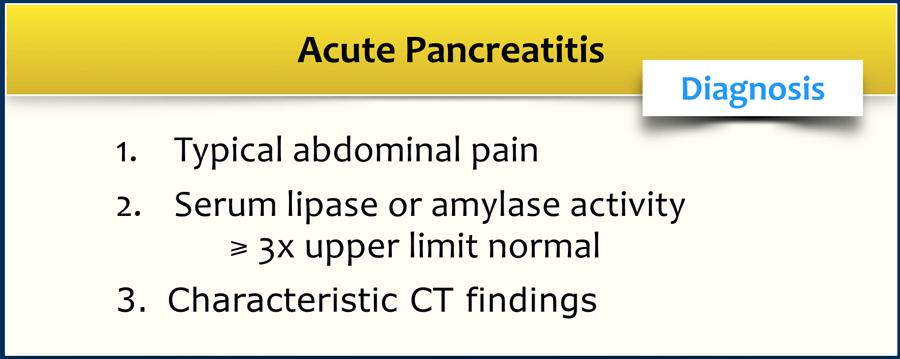 Khởi phát cấp tính với cơn đau vùng thượng vị dữ dội, dai dẳng, thường lan ra sau lưng. - Hoạt độ lipase hoặc amylase huyết thanh tăng ít nhất gấp ba lần giới hạn trên của mức bình thường.