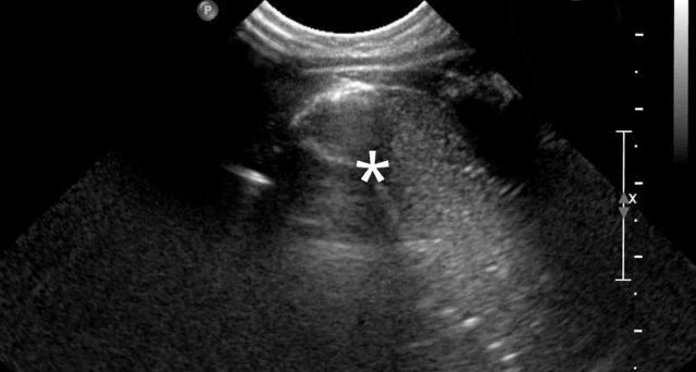 Siêu âm cho thấy nhu động ruột trong các cấu trúc chứa khí và dịch, xác nhận thoát vị cơ hoành lớn.