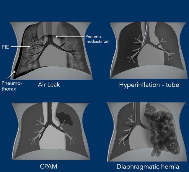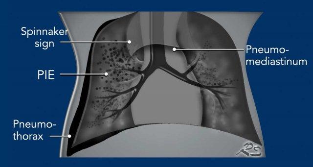 Hầu hết các bất thường phổi thấu quang trên X-quang là kết quả của sự rò rỉ khí, thường là biến chứng của hỗ trợ thông khí áp lực dương và biểu hiện dưới dạng:
