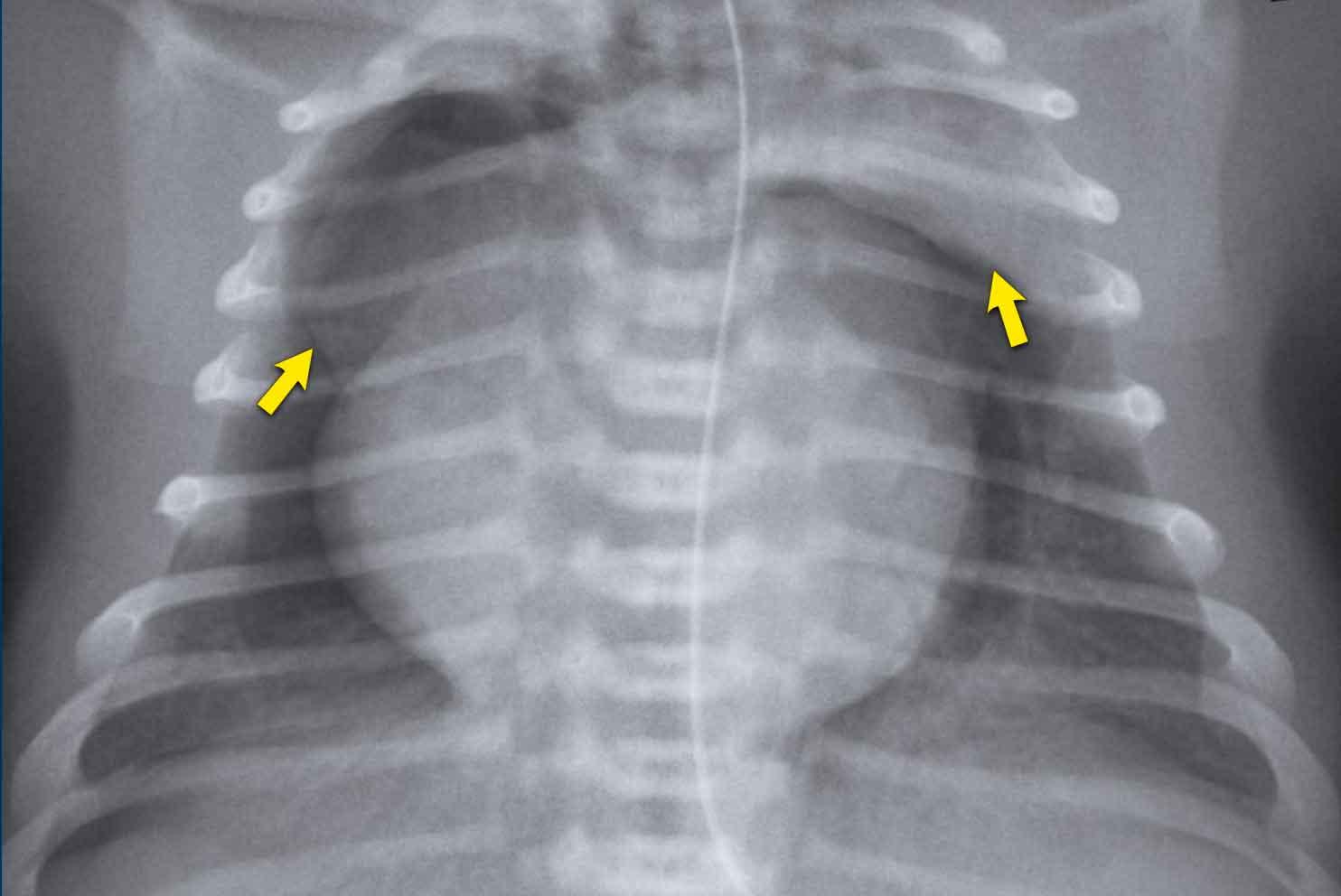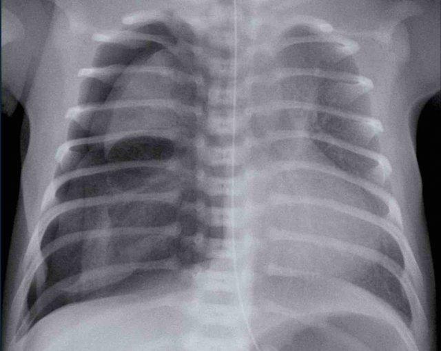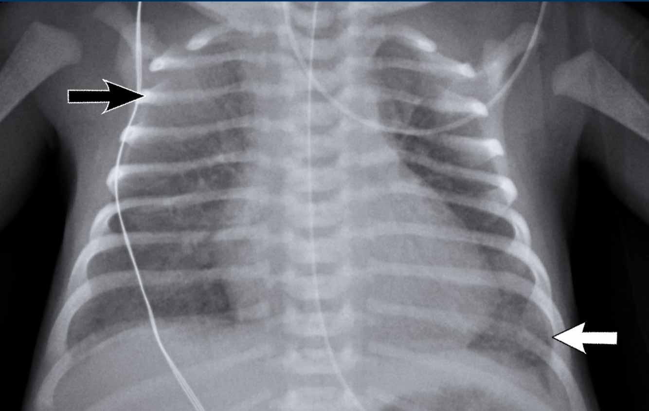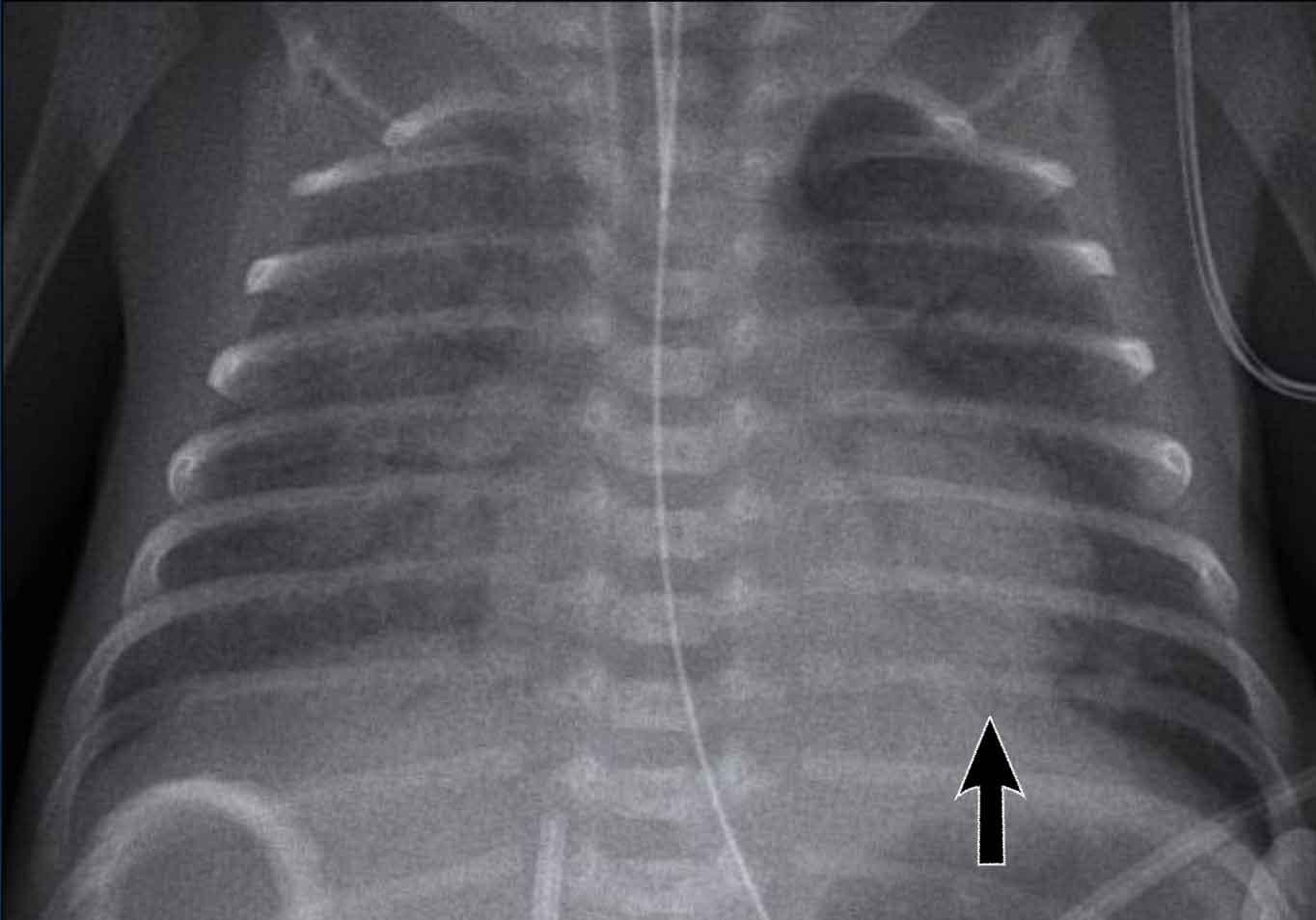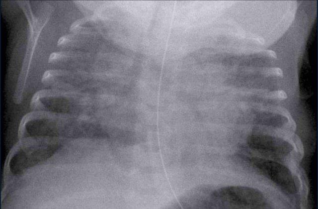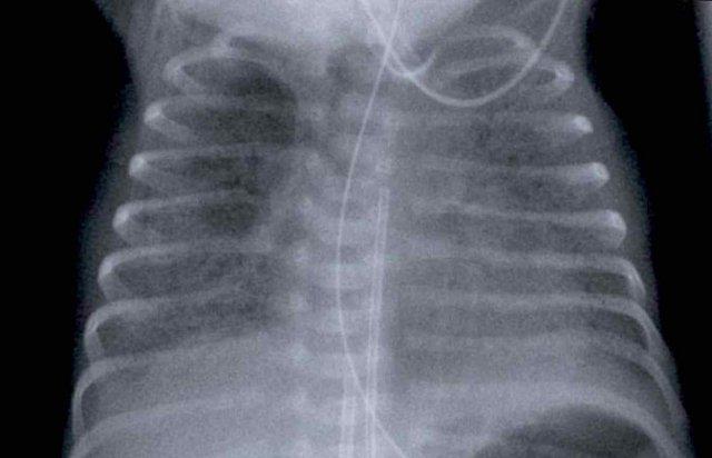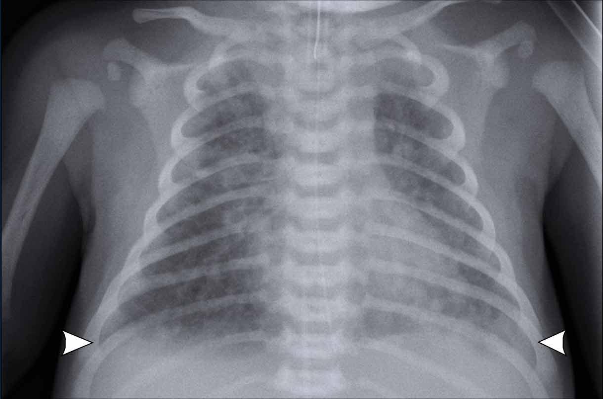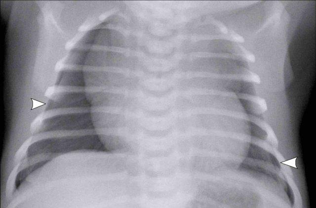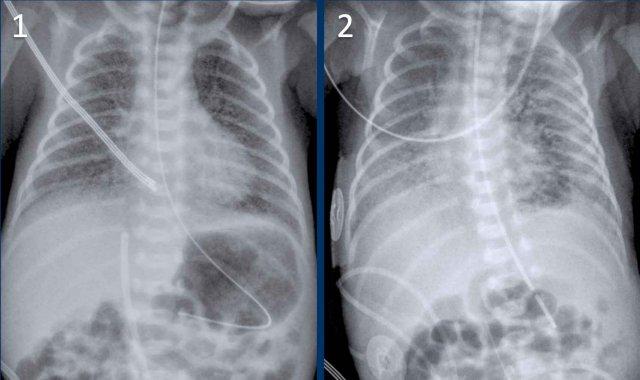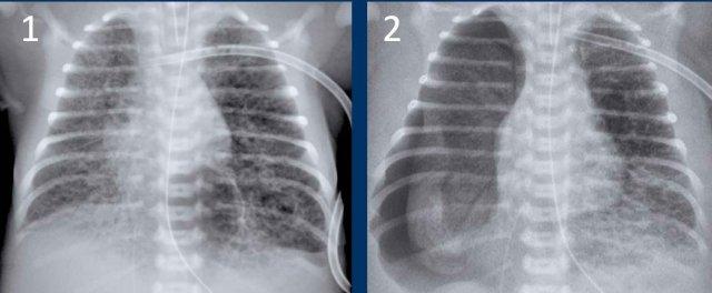 - Thường không có tràn dịch màng phổi. Hình ảnh X-quang có thể không đối xứng ngay sau liệu pháp surfactant xâm lấn tối thiểu (MIST) và có thể giống với các bệnh lý khác như viêm phổi sơ sinh.