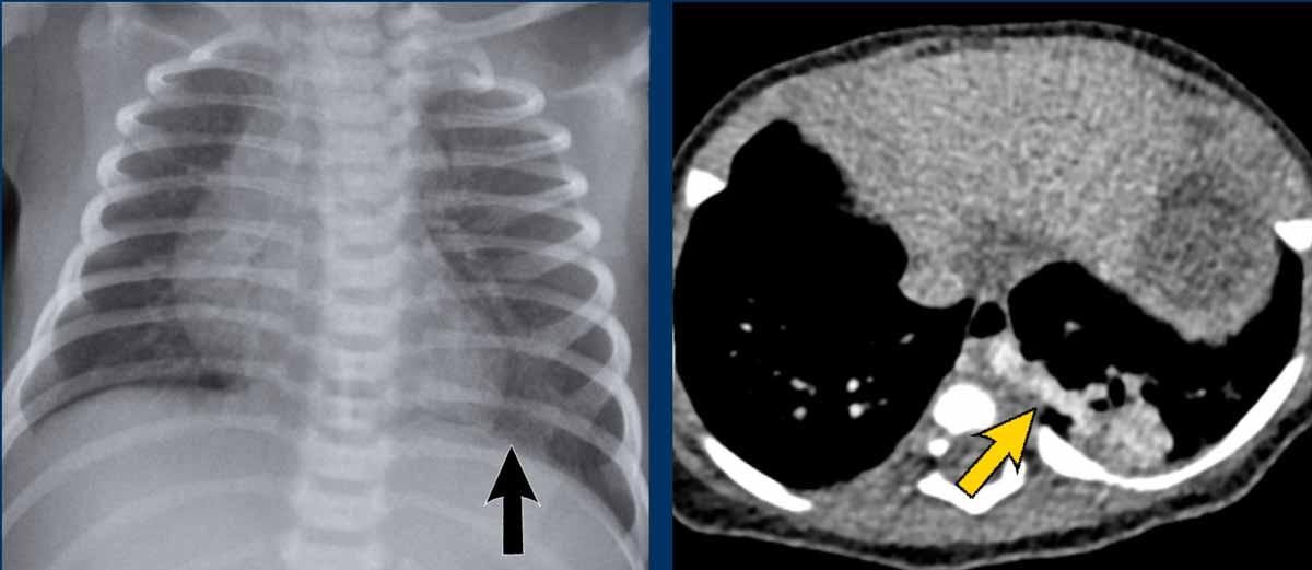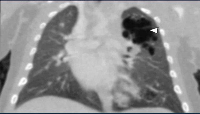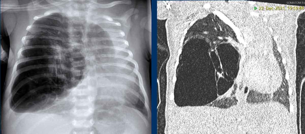CT scan lúc một tháng tuổi cho thấy tổn thương hỗn hợp, vừa dạng nang vừa dạng đặc, với một động mạch nuôi lớn xuất phát từ động mạch chủ xuống, phù hợp với chẩn đoán phổi biệt lập.