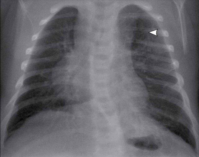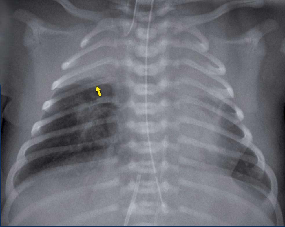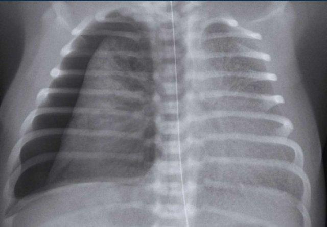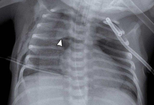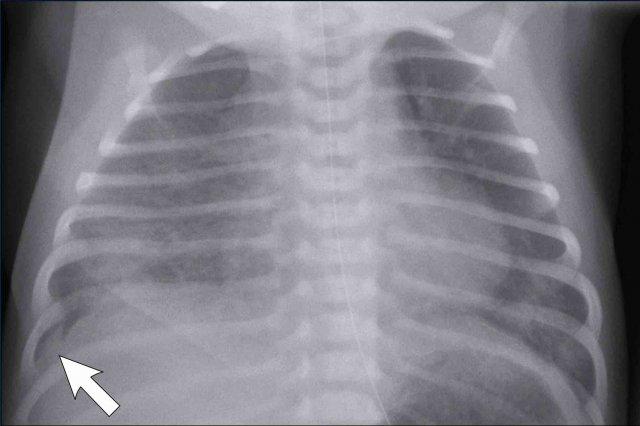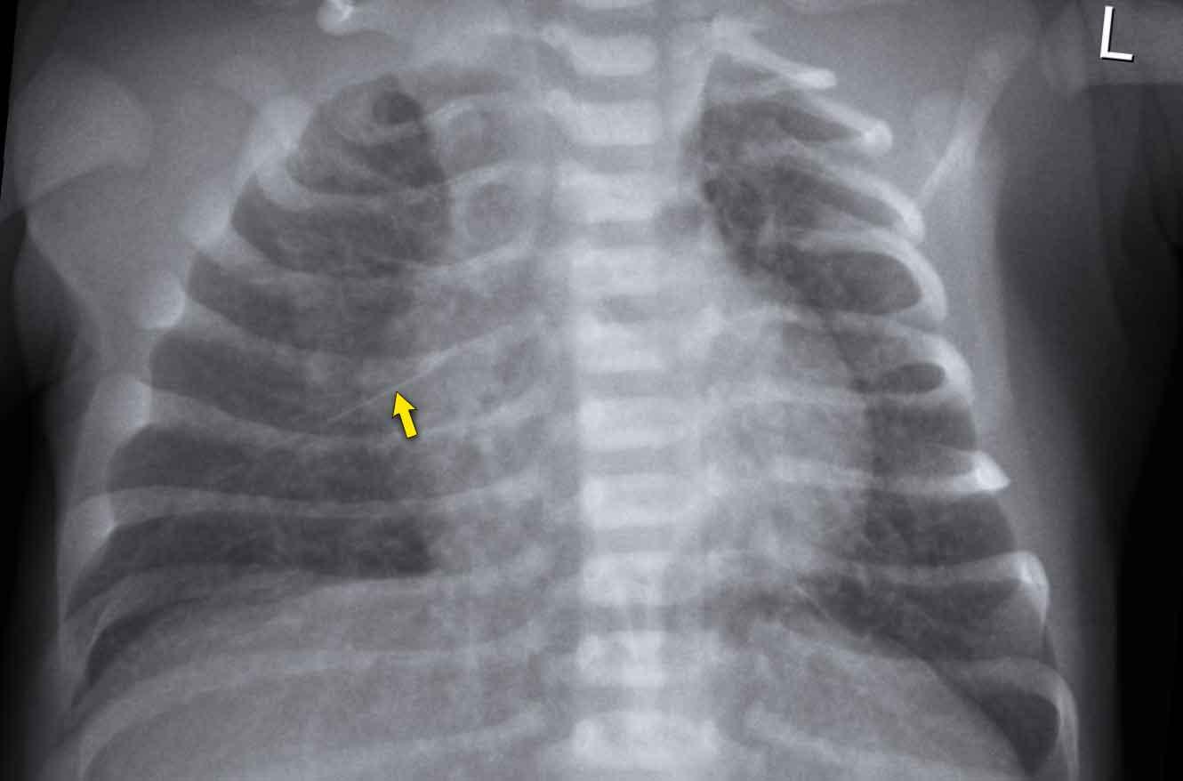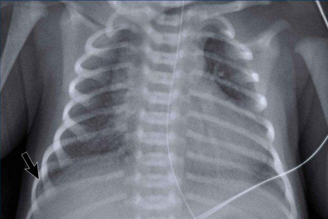Trong quá trình theo dõi, trẻ cũng phát triển tràn khí màng phổi bên phải.