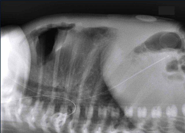 Phim ngực tư thế nghiêng cũng cho thấy các quai ruột trong lồng ngực.